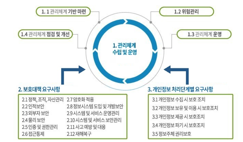 정보보호 및 개인정보보호 관리체계 인증기준은 크게 ʻ1. 관리체계 수립 및 운영ʼ, ʻ2. 보호대책 요구사항ʼ, ʻ3. 개인정보처리 단계별 요구사항ʼ 3개의 영역에서 총 102개의 인증기준으로 구성되어 있다.