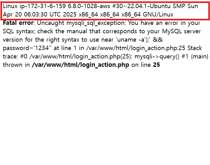 위 입력값은 의도적으로 입력 버퍼를 초과시키고, 이어서 system() 함수를 호출해 리눅스 서버의 커널 및 플랫폼 정보를 반환하도록 시도